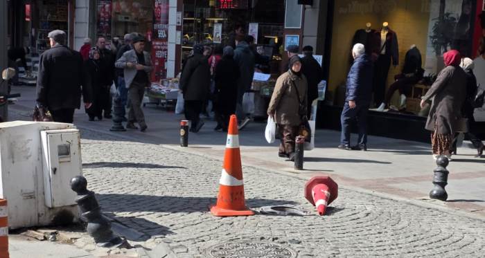 Arızalı dubanın bulunduğu noktaya, araçların yayalaştırılmış bölgeye girmesini önlemek için plastik trafik konileri yerleştirildi. Şehrin merkezindeki modern sistemin plastik hunilerle ikame edilmesi, çevredeki vatandaşların dikkatini çekti.