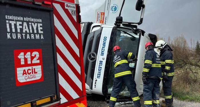 Eskişehir’de yağışlı havanın etkisiyle devrilen çöp kamyonunda bulunan 3 kişi yaralandı.