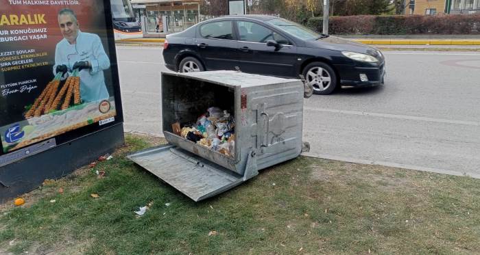 Konteynerin tekerleklerinin yerinden çıkmış veya darbe almış olabileceği görülürken, kapak mekanizmasının açık kalması çöp yığınının daha görünür olmasına neden oluyor. Çevredeki çim alanın üzerinde ambalajlar, poşetler ve çeşitli atıkların dağılmış olması, konteynerin bir süre bu şekilde kaldığını gösteriyor.