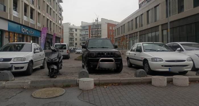 Bazı araçların arasındaki boşluklara motosikletlerin de park edildiği görülürken, bu durum alanın daha da sıkışık hale gelmesine neden oluyor. Kaldırım seviyesine yakın beton dubaların aralıklı yapısı, araçların bu noktaya rahatlıkla yanaşmasına imkân tanıyor.