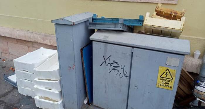 Balıkçılar Pazarı karşısında bulunan elektrik panosunun çevresine bırakılan strafor ve plastik kasalar, dikkat çekti. Üzerinde “Dikkat! Ölüm Tehlikesi” uyarısı bulunan panonun etrafında biriken atıklar, hem görüntü kirliliğine hem de güvenlik endişesine neden oldu.