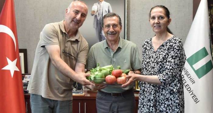 Eskişehir'de Batıkent Gönüllü Bahçelerinde 26 çeşit sebze yetiştirmeyi başaran emekli Nurten ve Metin Güler çifti, Tepebaşı Belediye Başkanı Dt. Ahmet Ataç’ı da makamında ziyaret ederek yetiştirdikleri ürünlerden armağan etti.