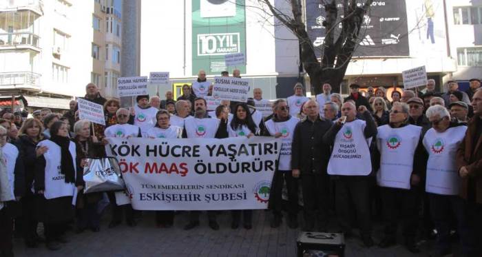 Tüm Emeklilerin Sendikası Eskişehir Şubesi, Hamamyolu’nda bir araya gelerek iktidara ‘insanca ücret’ çağrısı yaptı. Açıklamaya CHP Milletvekili Utku Çakırözer, CHP Milletvekili Jale Nur Süllü, CHP İl Başkanı Talat Yalaz, CHP Odunpazarı İlçe Başkanı Rahmi Çınar, üyeler ve emekliler destek verdi. Sendika adına basın açıklaması yapan Şube Başkanı Nalan Karagöz, “Yine TÜİK şaşırtmadı. Açıkladığı aralık ayı enflasyonu ve 2023 yılı için açıkladığı yıllık enflasyon gerçeği yansıtmıyor. Gerçek enflasyon emeklinin yaşadığı, halkın yaşadığı hayat pahalılığıdır. Yapacağınız maaş artışını bu kritere göre yapmalısınız.Yaşanan hayat pahalılığının giderilmesi, emeklilerin bir nebze de olsa insanca yaşaması için artık yüzdelik zamların bir anlamı kalmamıştır. Çünkü bu kadar düşük maaşların sebebi AKP iktidarının2008’de kanunlaştırdığı sözde ‘Sosyal Güvenlik Reformudur’. Bugün bu uygulama iflas etmiştir. İflas etmiş bu uygulamaya derhal son verilmelidir. Yeni bir yöntem bulunmak zorunludur. Yeni yöntemi biz söyleyelim. Emeklilere maaş bağlama oranı dul ve yetimleri de kapsayacak biçimde değiştirilmeli ve taban maaş uygulaması güncellenmelidir. Buna göre yıllarını çalışma hayatına vermiş, değer üretmiş, emekli hakkını almış ve emekli olmuş her bireyin taban maaşı, işe yeni başlamış en düşük memur maaşına eşitlenmelidir. Bugün için bu miktar 32 bin lira civarındadır. Emeklilerin ekonomik sorunlarının çözüm yolu budur. Bunun dışında yüzdelik artışlar çözüm değildir. Görünen TÜİK kılavuz istemez. İlerlemiş yaşlarına rağmen binlerce emekli Ankara’ya akın ederek 10 Aralık’ta Ankara’da görkemli miting ile taleplerini kamuoyu ile paylaşmıştı. İktidarın takip ettiğini biliyoruz. Fakat işlerine gelmediği anlaşılıyor. Zira taleplere dair henüz bir açıklama duymadık. Sahici bir çözüm yerine emeklileri oyalamayı, süreci seçimlere endekslemeyi tercih ediyorlar. Tekrar uyarıyoruz: En düşük emekli maaşı, en düşük memur maaşına eşitlenerek emekli taban maaşı belirlenmelidir. Emekli maaşları bu kriter üzerinden yeniden yapılandırılmalıdır.Tüm Emeklilerin Sendikası olarak taleplerimiz gerçekleşene kadar mücadelemizi kararlılıkla sürdüreceğiz” şeklinde konuştu.