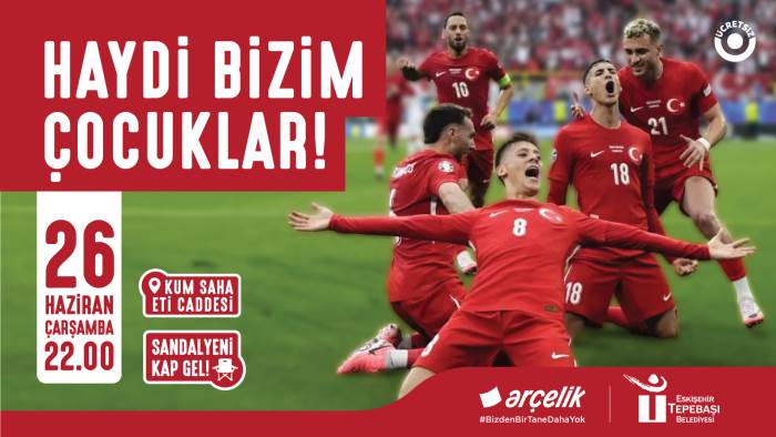 EURO 2024 coşkusunu birlikte yaşamak isteyen Eskişehirliler, saat 22.00’de Tepebaşı Belediyesi tarafından Arçelik sponsorluğunda ETİ Caddesi kum sahada kurulacak ekran karşısında buluşacak.