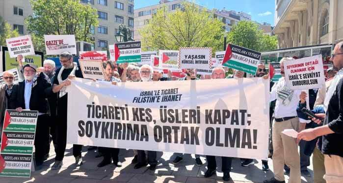 “Göstermelik kısıtlama kararlarını kabul etmediğimizi ve tüm kalemleri kapsayan erdemli bir ambargoyu talep ettiğimizi bugün bu meydandan ilan ediyoruz. Ayrıca Türkiye Cumhuriyeti Ticaret Bakanlığı tarafından açıklanan kısıtlama kararında Filistinli çocukları katleden uçakların ve askeri araçların yakıt tedarikine dair bir ibare bulunmamaktadır. Yine kısıtlama açıklamasında, ellerindeki silahlarla masum insanları avlayıp, bir de üstüne üstlük kendilerine sivil yerleşimci diyen katil sürüsünün silah malzemelerine dair maddeler de bulunmamaktadır. Ayrıca İsrail sokaklarında öldürülen her Gazzeli çocuk, kadın ve erkek için kutlama yapan Siyonist devletin destekçilerine gönderilen gıda maddeleri hala bu ülke gümrüklerinden çıkmakta bu ülkede üretilerek İsrail’e sevk edilmektedir. Açıklanan kısıtlama kararında, Gazze halkı açlıktan kırılırken, sokaklarda eğlenmek için insan öldüren üniformalı ya da sivil Siyonist çetelerin gıda tedarikine dair bir işaret de bulunmamaktadır.”