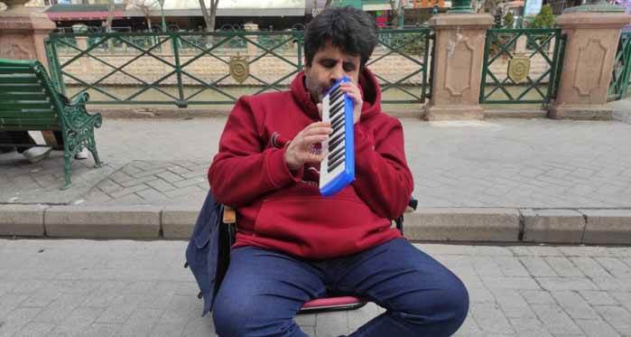 Eskişehir’de birkaç yıldır sokak sanatçılığıyla geçimini sağlayan ve yakın bir tarihte eşini kaybeden görme engelli Mehdi Karanli, yaşadığı zorluklara rağmen kötü hava şartlarında bile sanatını icra etmekten vazgeçmiyor