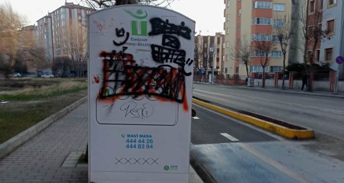 Eskişehir’in Eti Caddesi üzerinde bulunan ve sosyal dayanışma amacıyla kullanılan giysi kumbarası, üzerine yazılan yazılar ve sprey boyayla yapılan karalamalar nedeniyle hem işlevini hem de estetik görünümünü yitirdi.