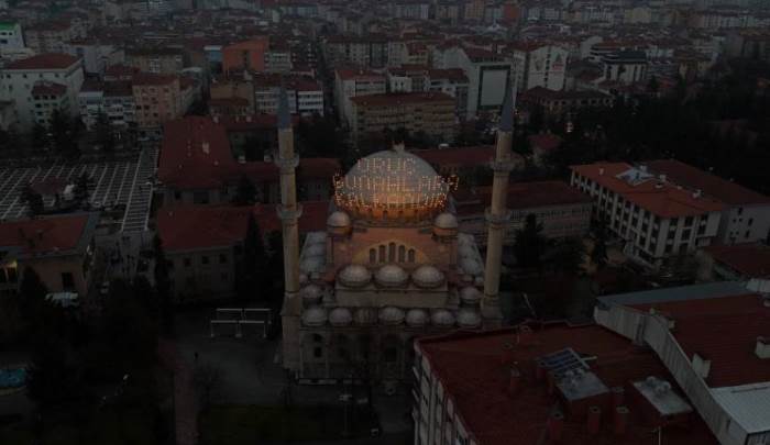 Eskişehir’de Ramazan Ayı’nın geleneği olan mahyada “Oruç günahlara kalkandır” ifadesi Reşadiye Cami’nin iki minaresi arasına asıldı.