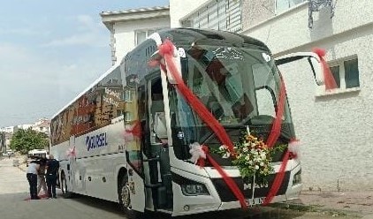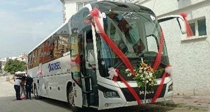 Alışılagelmişin dışına çıkan çift, gelin alıcı esnasında kullanmak için 50 kişilik yolcu otobüsü süsletti. Hazırladıkları ‘Gelin Otobüsü’ ile gelin alıcı yapan ve dünya evine giren çiftin düğünü, görenlerin ilgisini çekti.