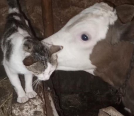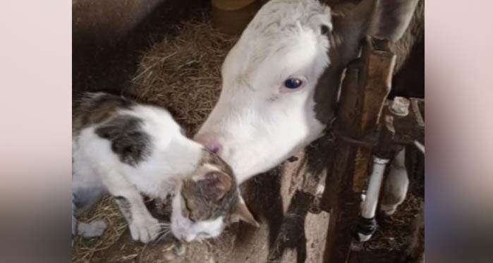 Eskişehir’de ahırda bağlı olan arkadaşı buzağıyı neredeyse her gün ziyaret eden kedinin halleri görenleri gülümsetti.