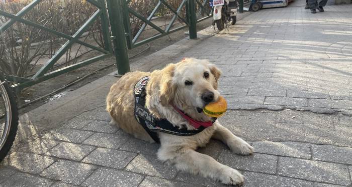 Eskişehir'de Yılmaz Büyükerşen Bulvarı üzerinde bulunan bir marketin maskotu haline gelen Golden cinsi bir köpek yediği yemekle herkesi şaşırtıyor.