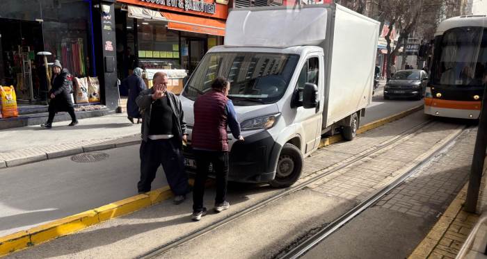 Eskişehir'de İki Eylül Caddesi’nde park edilen bir araç nedeniyle ilerleyemeyen kamyonet, manevra sırasında kaldırıma takıldı. Kısa süreli aksama yaşanırken, tramvay hattı üzerindeki risk bir kez daha gündeme geldi.