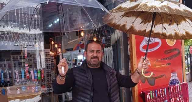 Eskişehir’de uzun yıllardır esnaflık yapan Tamer Yetişkul, yağışların artmasıyla şemsiye stokları yapmaya başladıklarını dile getirdi. Şemsiye fiyatları hakkında da bilgi veren Yetişkul, “Kış bu sene erken geldi, yağmurlar başladı. Geçtiğimiz yıllara göre şemsiye satışları bu yıl artışta. Son günlerde çok şemsiye sattık. Şemsiye çeşitlerimiz de çok. Yağmur yağınca şemsiyeye talep yoğun oluyor. Bu sene bol yağmur bekliyoruz inşallah. Şemsiye stoklarımızı hazırlıyoruz. 12 koli çeşitli modelde şemsiyemizi aldık. Kadın, erkek ve çocuk için ayrı şemsiye satıyoruz. Bardak, şeffaf, baston, yarı otomatik, tam otomatik şeklinde şemsiyelerimiz var. Fiyatlar 95 ile 500 lira arasında değişiyor” ifadelerini kullandı.