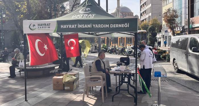 Hayrat İnsani Yardım Derneği, Hamamyolu’nda kurduğu stantla yoksul ve mağdur aileler için yardım topluyor.