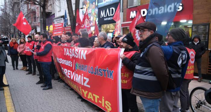 Nakliyat-İş Sendikası Şubesi, McDonald’s’ın Türkiye’deki lojistik faaliyetlerini yürüten Almanya merkezli HAVI Lojistik’te toplu iş sözleşmesi görüşmelerinden sonuç alınamaması üzerine grev kararını duyurmak için İsmet İnönü Caddesi’ndeki McDonald’s önünde bir araya geldi. “Sefalate teslim olmayacağız”, “İşçiye destek McDonalds’a boykot” sloganları eşliğinde açıklama yapan Nakliyat-İş Sendikası Şube Başkanı Ali Özçelik, yaklaşık 200 işçinin insanca yaşamaya yetecek ücret ve insan onuruna uygun çalışma koşulları talebiyle mücadele ettiğini belirterek grev sürecinin gerekçelerini anlattı. Nakliyat-İş Sendikası Şube Başkanı Özçelik, 6356 sayılı yasa kapsamında başlayan görüşmelerin işverenin uzlaşmaz tutumu nedeniyle sonuçsuz kaldığını ifade ederek, “Ardından girilen arabuluculuk sürecinde de herhangi bir mutabakat sağlanamamıştır. İşveren, yalnızca masadan kaçmakla kalmamış; yetki belgesi kapsamındaki bazı işyerlerini NACE kodu ve işkolu değişiklikleriyle hukuksuz biçimde sözleşme kapsamı dışına çıkarmaya çalışarak sendikal hakları fiilen gasp etmeye yönelmiştir. Ancak mesele yalnızca yöntem değil, dayatılan sefalet teklifidir. İşverenin sunduğu tekliflerin özeti şudur: Ocak 2026 için, yalnızca ilk 6 ayı kapsamak üzere yüzde 20 zam teklifi. Oysa TÜİK’in Aralık 2025 itibarıyla açıkladığı yıllık TÜFE yüzde 30,89’dur; bu oran işçinin ve emekçinin yaşadığı gerçek hayat pahalılığını yansıtmayan, gerçeği perdeleyen bir ‘resmi’ tablodur. İşverence teklif edilen yüzde 20’lik artış, bu gerçeği yansıtmayan resmi enflasyonun dahi 10 puandan fazla gerisindedir” diye konuştu.