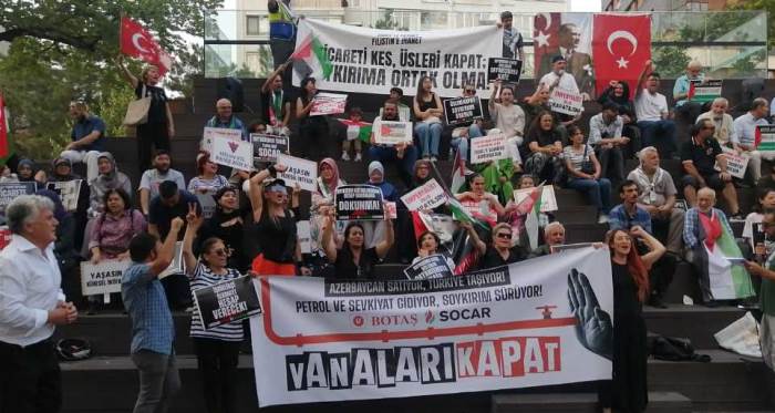 Eskişehir’de oluşturulan Filiskinle Dayanışma Platformu tarafından düzenlenen destek eylemlerinin biri daha gerçekleştirdi. Hamamyolu Yediler Parkında toplanan platform üyelerine çeşitli siyasi parti üyeleri de katılarak destek verdi. Platform adına söz alan Eskişehir Halkevi Şube Başkanı Cevat Aydemir “Yıllardır iki devlet tek millet sloganları atılan Azerbaycan devleti, AKP iktidarı ile birlikte İsrail’de yaşanan soykırımın suç ortaklarıdır. Yeni gerçeklik iki devlet tek millet değil iki devlet tek suç ortaklığıdır. Bu sevkiyatı gerçekleştiren şirket BOTAŞ, yani Cumhurbaşkanı Erdoğan’a bağlı Varlık Fonuna ait bir şirket. Sürekli Filistin hassasiyetinden bahseden AKP iktidarı halkı timsah gözyaşlarıyla uyutmaya çalışarak bu kirli ticaretine devam ediyor. Bu sevkiyatı durdurma imkânı olan sadece AKP iktidarı ve Cumhurbaşkanıdır. Sürekli hatırlatmaya devam edeceğiz, suçlusunuz, riyakârsınız, ikiyüzlüsünüz ve bunun hesabını halka er geç vereceksiniz” dedi.