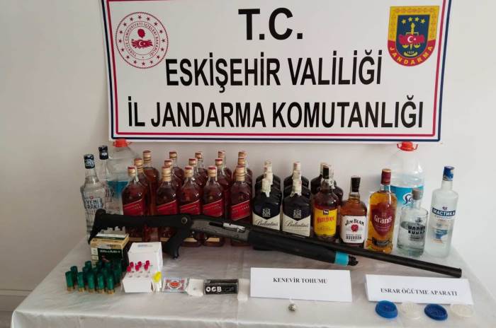 Edinilen bilgilere göre, İl Jandarma Komutanlığı’na bağlı Kaçakçılık ve Organize Suçlarla Mücadele (KOM) Şube Müdürlüğü ekipleri tarafından Seyitgazi İlçesi’nde uyuşturucu madde kullanan ve kaçak yollardan temin ettiği alkollü içecekleri satarak haksız kazanç elde ettiği tespit edilen şahsın yakalanması amacıyla çalışma gerçekleştirildi. Adli makamlardan alınan izinlerin ardından düzenlenen operasyonu sonucu şahıs yakalanırken, ikametinde yapılan aramalarda 1 adet uyuşturucu madde öğütücü aparat, 3 gram kenevir tohumu, 52 adet esrar sarımında kullanılan kağıt, 1 adet ruhsatsız av tüfeği, 14 adet av tüfeği fişeği, 40 litre kaçak alkollü içecek, 9 adet alkol kalite kontrol test kiti ele geçirildi.