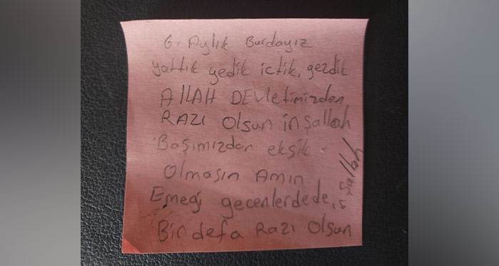 6 Şubat Kahramanmaraş merkezli depremlerde 11 il ciddi yıkıma uğrarken çok sayıda vatandaş, yakınını ve evini kaybetti. Tarifsiz acı sonrası başta devletin birçok kurumu olmak üzere, vatandaşlar yardım için bölgeye gitti. Depremzedeler ülke genelindeki öğrenci yurtlarına yerleştirildi. O yurtlardan biri de Eskişehir’deki KYK Doğan Aslan Bey yurdu oldu. Benzer olayları yaşayan depremzedeler yaklaşık 7 ayın sonunda memleketlerine dönmeye başladı. O depremzedelerden birinin ufak kâğıt parçasına kurşun kalemle yazdığı not ise duygulandırdı. Kendilerine yardımcı olan herkese teşekkür eden depremzede, şu ifadeleri kaleme aldı; “6 aydır buradayız yattık, yedik, içtik, gezdik. Allah devletimizden razı olsun inşallah, başımızdan eksik olamasın, amin. Emeği geçenlerden bin defa razı olsun inşallah.”