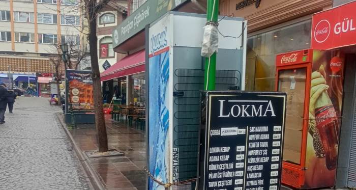 Direğe sabitlenen menü panosuyla birlikte işletmenin soğutucu ünitesinin de kaldırıma yerleştirildiği gözlemlendi. Bu durum, özellikle dar alanlarda yaya geçişini daha da sınırladı.