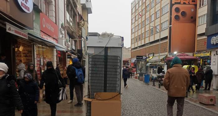Eskişehir’de Hamamyolu Caddesi’nde kaldırım ve saksılık alan bir esnaf tarafından buzdolabıyla işgal edildi; yaya geçişi zorlaştı.