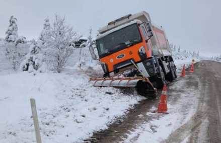 Eskişehir’in Mihalıççık ilçesinde karlı yolları açmakla görevli kar küreme kamyonu yoldan çıktı.