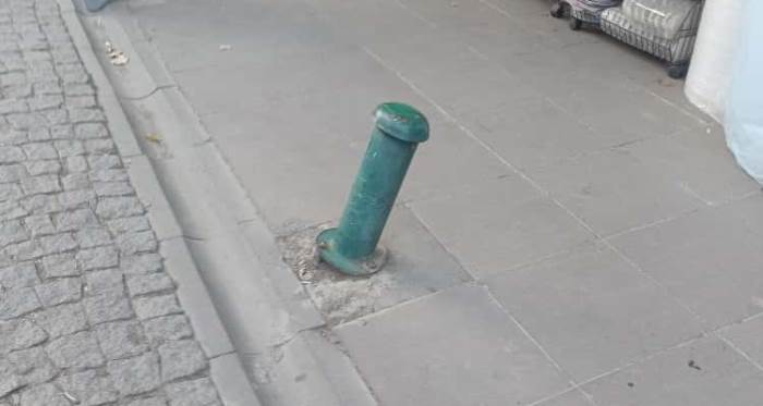 Eskişehir’in İstiklal Mahallesi’nde kaldırım kenarında bulunan bir dubanın kırık olduğu görüldü. Araçların çarpması sonucu zarar gördüğü tahmin edilen dubanın eğilmiş hali, hem yayalar hem de araçlar için risk oluşturuyor.