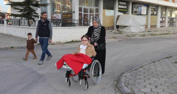 Bir bacağı diğerinden kısa olan pev hastası Eskişehirli 7 buçuk yaşındaki Zeynep İkra’yı kucağında her gün sınıfına taşıyan annesi Aynur Albayrak, herkesin bir engelli adayı odluğunu hatırlatarak okula engelli asansörü yapılmasını talep etti.