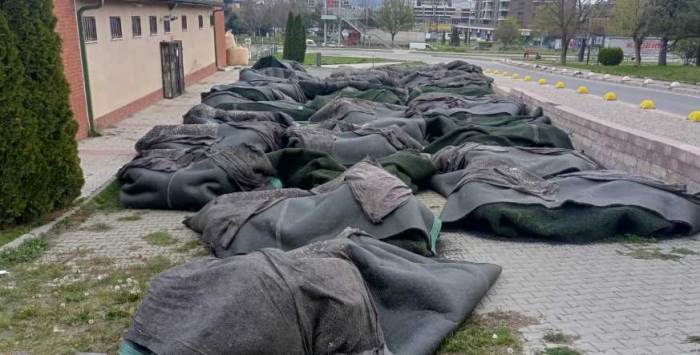 Suni çim parçalarının büyük yığınlar halinde üst üste bırakıldığı, bazı bölümlerde ise zemine doğru yayıldığı gözlendi. Koyu renkli kaplamaların geniş bir alanı kapladığı ve düzensiz bir görüntü oluşturduğu dikkat çekti.