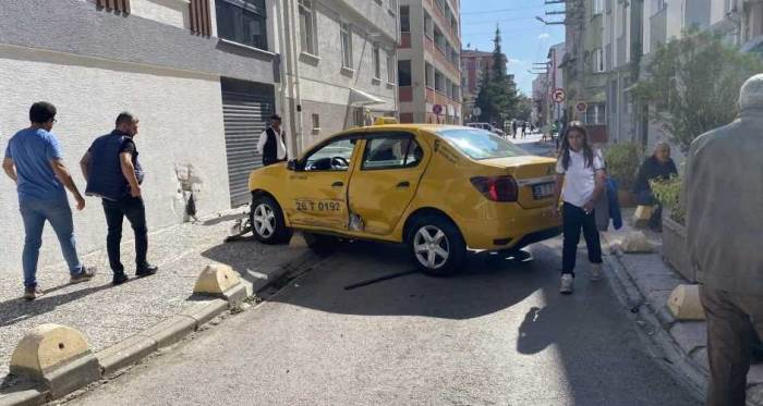 Eskişehir'de ara sokakta hafif ticari aracın yandan çarptığı taksi, savrulup apartman duvarına çarptı