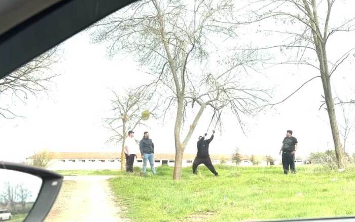 Birinin elinde balta da bulunan şahısların mangal için ağaca zarar vermeye çalıştığı iddia edildi. Gruptan bir başka şahsın ağaç dalına balta salladığı görüldü. Dala takılan ipe asılan şahısların uğraşı ‘pes' dedirtti.