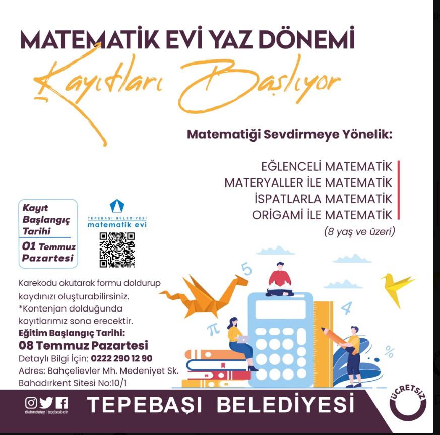 Merkezde gerçekleştirilecek yaz dönemi eğitimleri kapsamında eğlenceli matematik, materyaller ile matematik, ispatlarla matematik ve origami ile matematik 8 yaş ve üzeri öğrenciler ile buluşacak. Eğitimlere kayıt olmak isteyenler kayıt formuna, duyuru görselinde yer alan QR kod ve https://tinyurl.com/matematikyaz linki üzerinden ulaşabilecek. 1 Temmuz Pazartesi günü başlayacak online kayıtların ardından Matematik Evi’nde eğitimlerin başlangıç tarihi ise 8 Temmuz Pazartesi olarak belirlendi. Bahçelievler Mahallesi Medeniyet Sokak Bahadırkent Sitesi No: 10/1 adresindeki Matematik Evi hakkında bilgi almak isteyen vatandaşlar, 0 (222) 290 12 90 numaralı telefondan yetkililere ulaşabiliyor.
