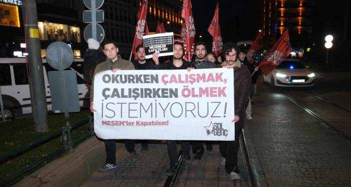 SOL Genç İl Örgütü, Milli Eğitim Bakanlığı’nın (MEB) Mesleki Eğitim Merkezi (MESEM) uygulamasına tepki göstermek amacıyla Köprübaşı’ndan İsmet İnönü Caddesi’nde yer alan bir AVM önüne kadar “MESEM’ler insanlık suçudur”, “Laik bilimsel demokratik eğitim” sloganları eşliğinde yürüyüş gerçekleştirdi. Burada SOL Genç İl Örgütü adına konuşan Deniz Bursalı, uygulamayı eleştirerek, MEB’in zorunlu eğitim süresini kısaltılmasının çocuk işçiliği yaygınlaştırmak olduğunu savundu. SOL Genç İl Örgütü adına açıklama yapan Bursalı, 2025 yılında en az 87 çocuğun MESEM uygulaması kapsamında hayatını kaybettiğini dile getirerek, “Bu düzenin sorumlusu tek adam rejiminin tarikatçı-piyasacı aparatı Yusuf Tekin’e ve yaratılan kirli MESEM düzenine karşı bir araya gelen 16 arkadaşımız hala cezaevinde. Bu katil düzene karşı olduğumuz her alanda hep birlikte omuz omuza mücadeleyi büyütmeye devam edeceğiz. Katil sömürü düzeni, yeni canlar almaya devam ediyor. Her gün daha da vahşileşen bu katil düzenin çarkları arasında hayatta kalmaya çalışan birçok sıra arkadaşımız ve çok sayıda çocuk maalesef artık aramızda değil. Biliyoruz ki bu ölümler kaza değil, sistemli, acımasız bir sömürünün sonucu. Her gün sayısız çocuk ve sıra arkadaşımız kayıt dışı atölyelerde, tarım alanlarında, madenlerde ve taşeron şirketlerde sessizce yok sayılıyor. Her çocuk için zorunlu olan eğitim hakkına göz göre göre saldırılıyor. Zorunlu eğitim süresinin kısaltılmasındaki amaç kamusal eğitim hakkını gasp etmektir. Amaç patron örgütleri istedi diye, sermayenin erken yaşta ucuz, hatta bedava iş gücü ihtiyacı için, çocuk yaşta işçiliği ve çocuk yaşta evlilikleri yaygınlaştırmaktır. Amaç ‘meslek ortaokullarının’ da açılmasıyla tüm okulları MESEM’leştirmektir” diye konuştu.