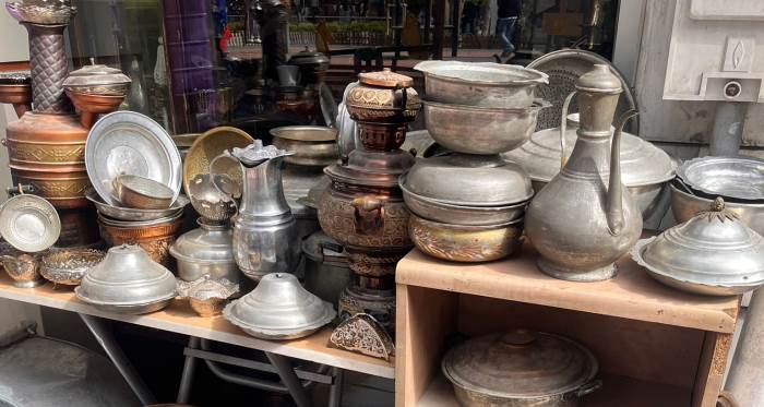 Hamamyolu’nda bulunan bir spotçu dükkânı, eski zamanlarda kullanılan kap kacak ve ibriklerin satışıyla ilgi odağı haline geldi.