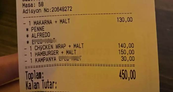 Eskişehir'den paylaşılan adisyondaki bilgiler; 2 Makarna + 2 alkollü içecek 130 TL, 1 tavuklu wrap + 1 alkollü içeçek 140 TL, 1 hamburger + 1 alkollü içecek 150 TL ve kampanyalı alkollü içecek ise 30 TL şeklinde yer aldı. Toplamda hesap 450 TL geldi.