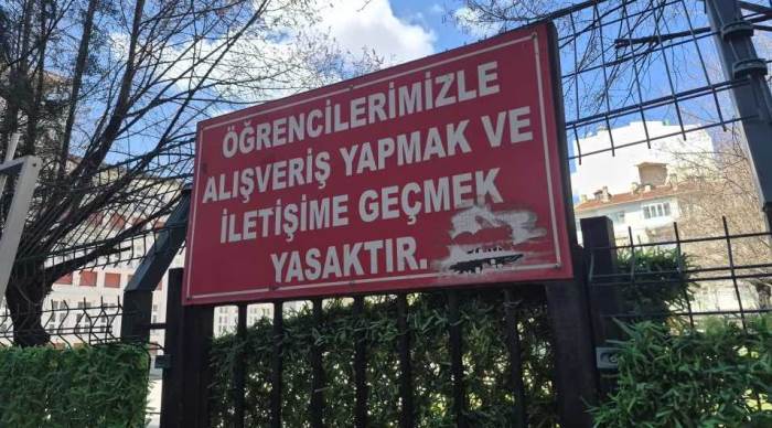 Hacı Süleyman Çakır Kız Anadolu Lisesi'nin dış cephesindeki tel örgülere asılan kırmızı zeminli tabela, üzerindeki sert ifadelerle görenleri şaşırttı. Tabela üzerinde yer alan "Öğrencilerimizle alışveriş yapmak ve iletişime geçmek yasaktır" yazısı, çevredeki vatandaşlar tarafından merak konusu oldu.