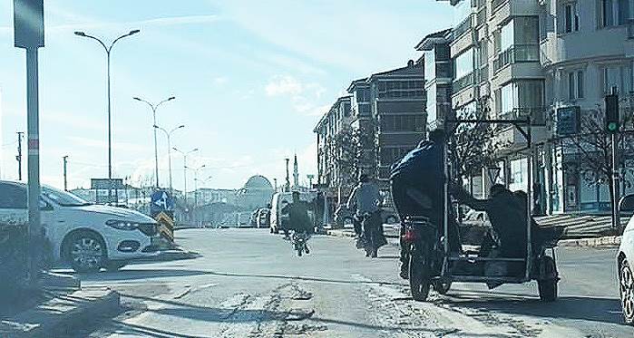 Emek Mahallesi Albayrak Bulvarı kaydedilen görüntülerde, biri sepetli üç plakasız motosikletin sürücülerinin trafikteki tehlikeli hareketleri tedirgin etti. Görüntülerde, kasksız bir şekilde 2 motosikletle seyreden şahısların yanına sepetli ve üzerinde 4 şahısın olduğu 3'üncü bir motosiklet yanaşıyor. Çocuk olduğu düşünülen şahıslar sohbet ettikten sonra yeşil yanmadan kırmızı ışıkta yollarına tek teker üzerinde devam ediyorlar. Motosikletleriyle kasksız bir şekilde, tek tekerlek üzerinden ilerleyen şahıslar trafiği ve kendilerini tehlikeye attığı görüntüler tedirgin attı.