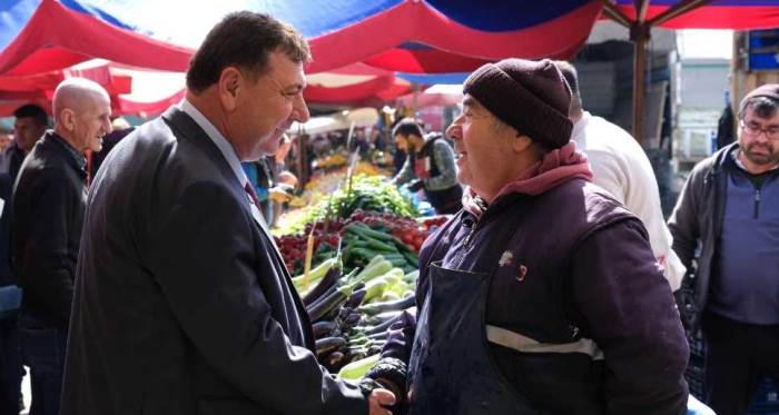 Özkan Alp pazar esnafı ile buluştuktan sonra Nilüfer Caddesi esnaflarını da ziyaret etti. Özkan Alp’e ziyaretleri sırasında Belediye Meclis Üyesi Adayları Mehmet Kepez ve Barış Toprak da eşlik etti.