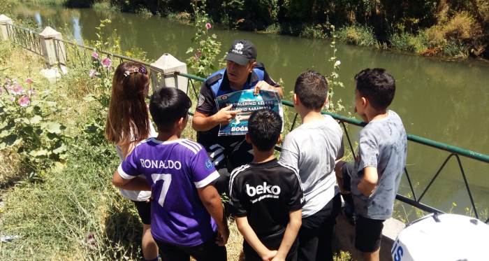 Eskişehir'de polis ekiplerince; güvenli olmayan çay, gölet ve sulama kanalı gibi yerlere serinlemek amacıyla girilmesi nedeniyle vatandaşlara yönelik bilgilendirme çalışmaları gerçekleştirildi.