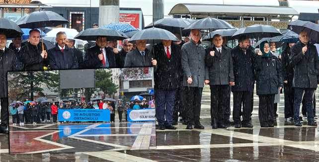 Program sırasında dikkat çeken detay ise protokol alanında yaşandı. Törene katılan protokol üyelerinin şemsiyeler altında yağmurdan korunması, alanda etkinlikler için bulunan öğrencilerin ise bir bölümünün yağmur altında ıslanması tepki çekti.