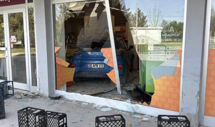 Kontrolden çıkan otomobil, yol kenarında bulunan bir süpermarketin camını kırarak içeri girdi. Kazada iş yerinde maddi hasar meydana gelirken, olay sırasında markette bulunanlar büyük panik yaşadı.