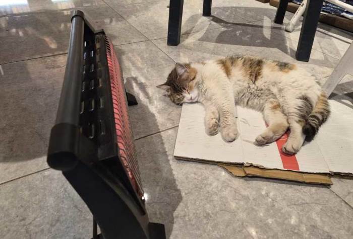 Eskişehir'de soğuktan üşüyen bir sokak kedisi, ısınmak için sığındığı bakkal dükkanında elektrikli ısıtıcının karşısına geçip uyudu.