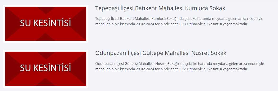 Odunpazarı'nda da Gültepe Mahallesi Nusret Sokak'ta ise saat 11:20'de başlayan su kesintisi sürüyor.