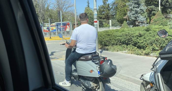 Sürücünün bu hareketi, hem plakayı görünmez hale getirdi hem de trafikte tehlike oluşturdu. Yanında taşıdığı kaskı güvenlik için kullanmayan sürücü, seyir halindeyken fark edilen tehlikeli durumu gözler önüne serdi.