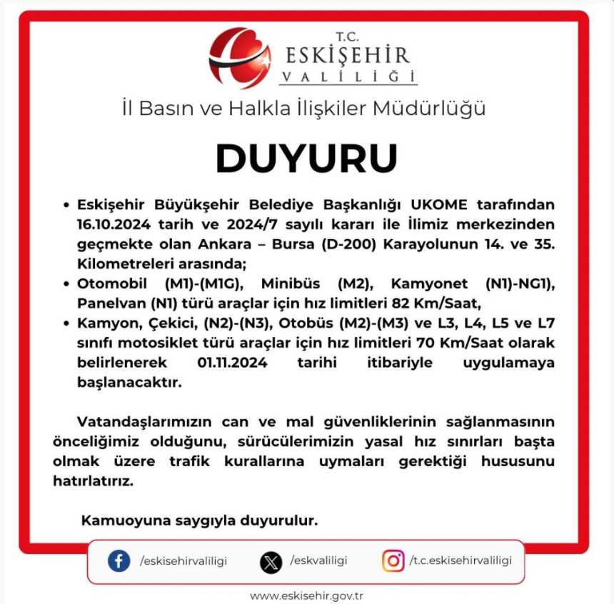 Eskişehir Valiliği, Ankara-Bursa (D200) karayolunun 14. ve 35. kilometreleri arasında bazı araç türleri için hız limitlerinin düşürüleceğini duyurdu.