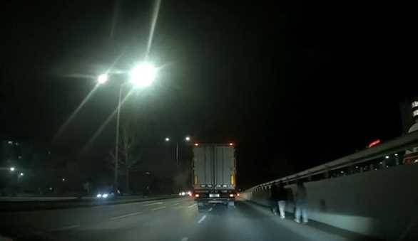 Ağır vasıta araçlarının ve otomobillerin yüksek süratle seyrettiği bölgede yürüyen şahısların, fark edilmelerini sağlayacak hiçbir reflektörlü kıyafet taşımamaları tehlikeyi iki katına çıkardı. O esnada yolda ilerleyen bir kamyon şoförü, karanlıkta adeta "görünmez" olan yayaları son anda fark etti. Şoförün dikkati ve ani manevrası sayesinde şahıslara çarpmaktan son saniyede kurtulduğu anlar, çevredeki vatandaşların kamerasına yansıdı.