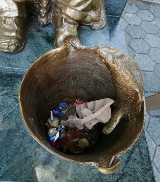 Eskişehir Porsuk Çayı kenarında yer alan ve hem yerli hem de yabancı turistlerin yoğun şekilde fotoğraf çektirdiği heykel, bilinçsiz vatandaşların hezimetine uğradı. Heykeldeki balık kovası, üzerinde yer alan “Allah rızası için Porsuk Çayı’nı kirletmeyin” yazısına rağmen adeta çöp kovasına döndü.