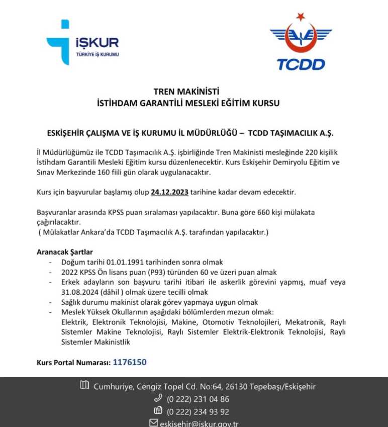 İŞKUR Eskişehir sosyal medya hesabı üzerinden yapmış olduğu paylaşımda, "İl Müdürlüğümüz ile TCDD Taşımacılık A.Ş. işbirliğinde Tren Makinisti mesleğinde 220 kişilik İstihdam Garantili Mesleki Eğitim Kursu düzenlenecektir. Kurs için başvurular başlamış olup 24.12.2023 tarihine kadar devam edecektir." duyurusunu yaptı.