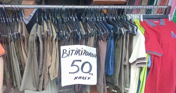 Eskişehir Hamamyolu Caddesi’nde bir esnaf, “bitiriyoruz” etiketiyle gömlek, pantolon ve çeşitli kıyafetleri 50 TL’den satışa sundu.