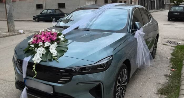Düğün konvoyunda yerini alan yerli sedan araç, hem yakın akrabalar hem de vatandaşlar tarafından ilgi odağı oldu. Gelini baba evinden alan damat Emre Tuncer, konvoy eşliğinde düğün mekanına ulaştı.