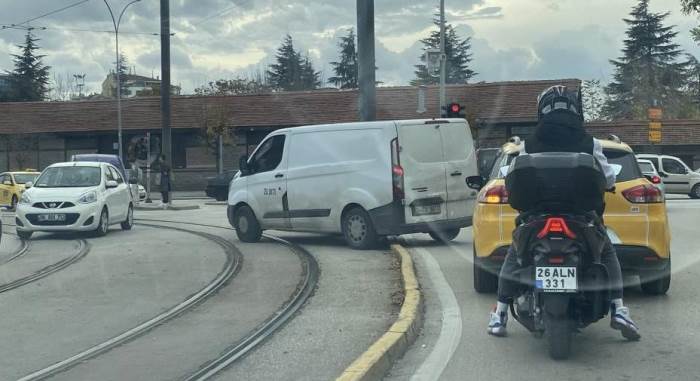 Eskişehir’de kırmızı ışıkta beklemek yerine tramvay yolunun kenarındaki banket üzerinden dönüş yapan panelvan araç, trafikteki sürücüleri hayrete düşürdü. O anlar cep telefonu kamerasına yansıdı.